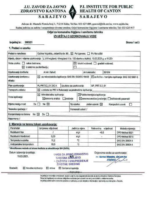 Nakon ponovljene analize vode, stigao je izvještaj o mikrobiološkom ispitivanju vode i na osnovu tog izvještaja zaključeno je da ispitani uzorak vode sa pomenutog lokalnog vodovoda ODGOVARA prema Pravilniku o zdravstvenoj ispravnosti vode za piće ( „Službeni glasnik BiH“ br.40/10, 30/12, 62/17) i voda se može koristiti za svakodnevnu upotrebu.