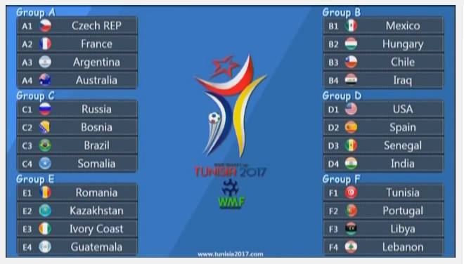 Naši reprezentativci nastupaju u Grupi C, zajedno sa selekcijama Rusije, Brazila i Somalije. Svoj prvi meč igraju u subotu 7.oktobra protiv Rusije u 17:45 po našem vremenu. Drugi protivnik im je Brazil u ponedjeljak 9.oktobra od 19 sati dok će posljednji susret u grupi odigrati u srijedu 11.oktobra od 14 sati protiv Somalije. Sve detalje sa Svjetskog kupa možete pratiti na oficijelnoj stranici prvenstva tunisia2017.com. Našim momcima želimo puno sreće i uspjeha.
