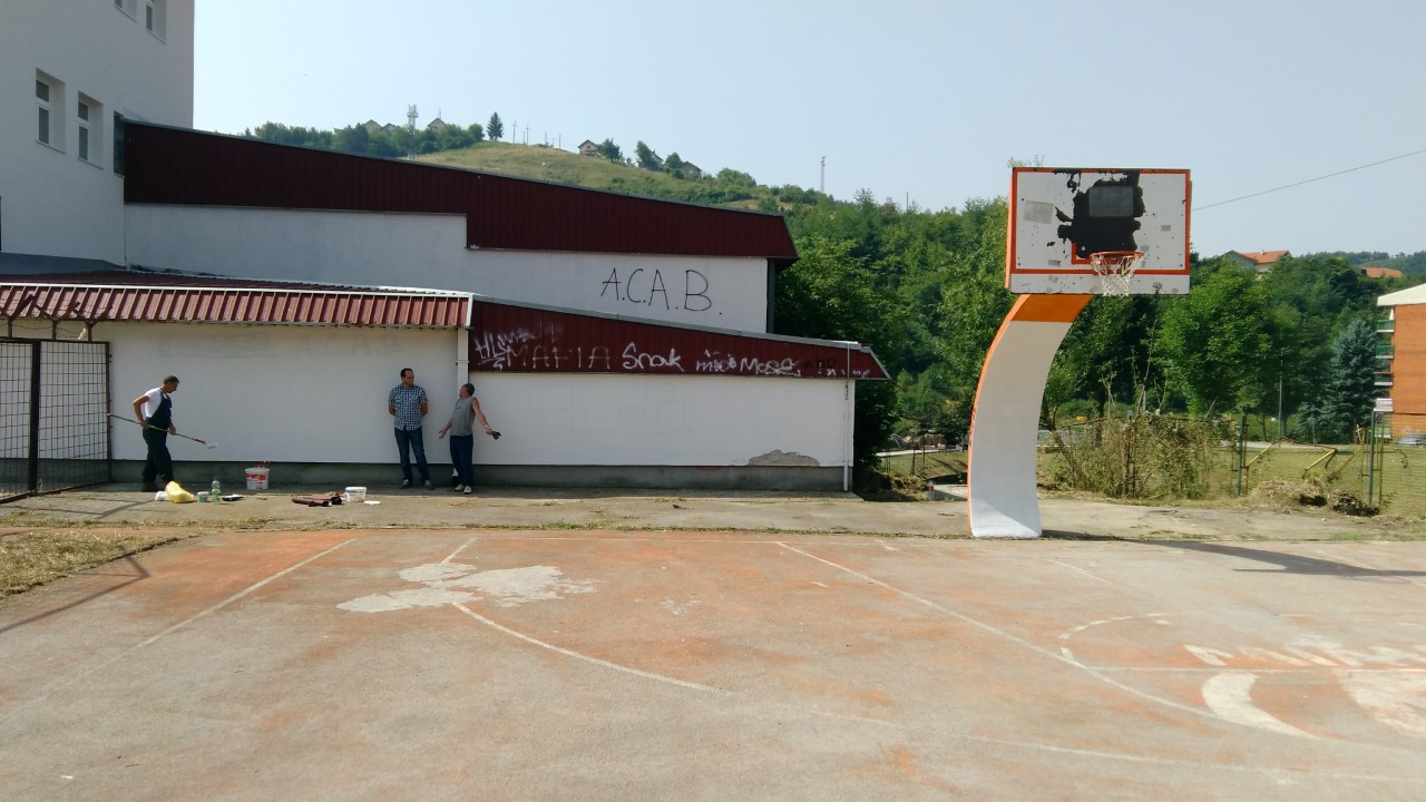 Smeće koga je bilo na cijeloj lokaciji u većim količinama, prikupljeno je odvojeno u kese i odloženo u kontejnere. Grafiti sa neprimjerenim sadržajima, koji su bili ispisani na zidu školske dvorane pored igrališta, na spomen ploči i koševima, uz pomoć namjenske boje za beton prefarbani su i prekriveni.