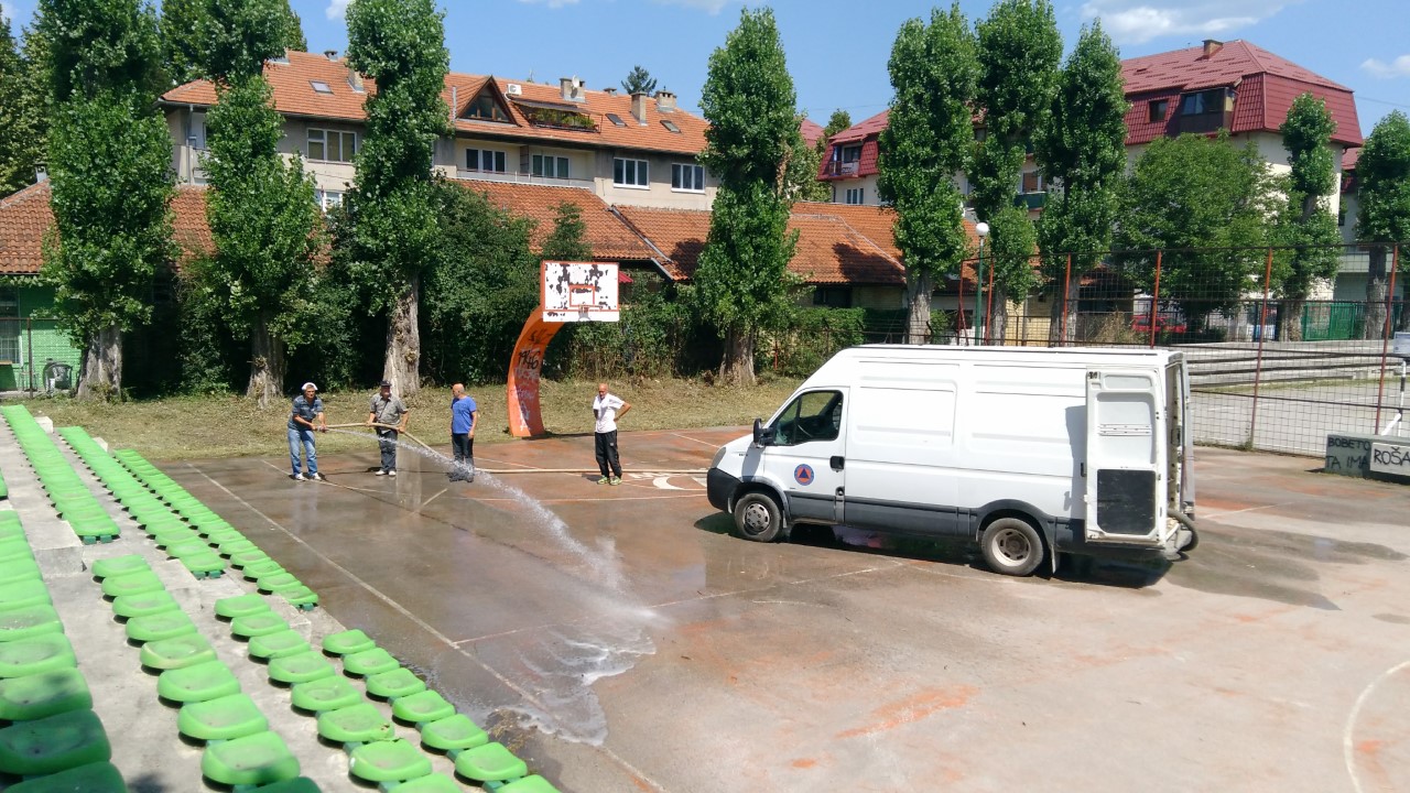 Nakon čišćenja i prikupljanja otpada značajnu podršku je pružio KJKP “Park” sa namjenskim vozilom, tako da je sav materijal isti dan sa lokacije prevezen na gradsku deponiju. Po završetku radova povjerenici su izvršili detaljno sapiranje košarkaške plohe i tribina.