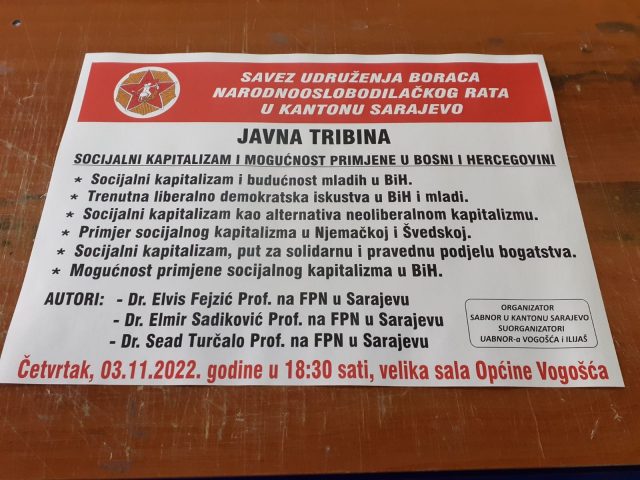 Savez udruženja boraca NOR-a Kantona Sarajevo zajedno sa općinskim organizacijama Udruženja antifašista i boraca NOR- a llijaš i Vogošća, sutra u 18:30 u velikoj općinskoj sali organizuje tribinu o temi: Socijalni kapitalizam i mogućnost primjene u BiH. O ovoj temi govorit će eminentni profesori sa Fakulteta političkih nauka u Sarajevu: dr.Elvis Fejzić, dr. Elmir Sadiković i dr. Sead Turčilo.